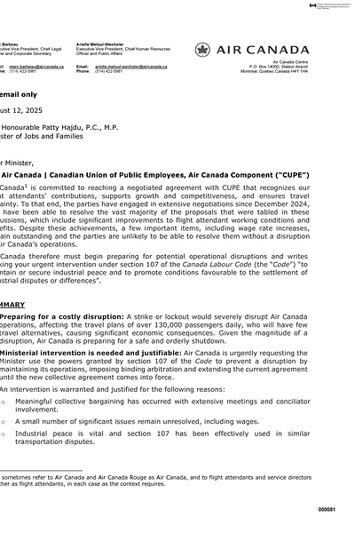 Air Canada’s letter to Minister Patty Hajdu compared a strike shutdown to the 9/11 airspace closure. They pushed hard for early Section 107 action under the Canada Labour Code to keep planes flying. She stepped in hours after the walkout started anyway. I checked the HUMA committee evidence. CUPE reps said the tactic killed bargaining trust. Quick fixes protect passengers but skip real talks every time. https://www.ourcommons.ca/DocumentViewer/en/45-1/HUMA/meeting-20/evidence